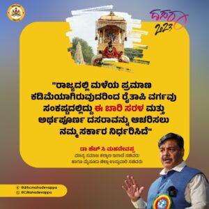 ರಾಜ್ಯದಲ್ಲಿ ಮಳೆಯ ಪ್ರಮಾಣ ಕಡಿಮೆಯಾಗಿರುವುದರಿಂದ ರೈತಾಪಿ ವರ್ಗವು ಸಂಕಷ್ಟದಲ್ಲಿದ್ದು,ಈ ಬಾರಿ ಸರಳ ಮತ್ತು ಅರ್ಥಪೂರ್ಣ ದಸರಾ ಆಚರಿಸಿಲು ನಮ್ಮ ಸರ್ಕಾರ ನಿರ್ಧರಿಸಿದೆ.