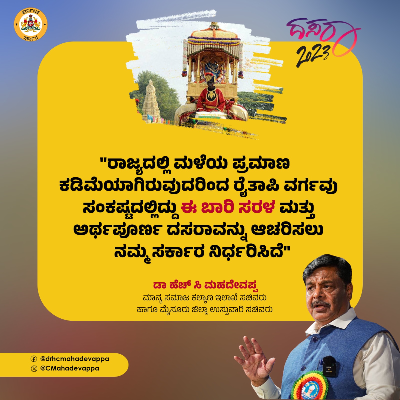 ಮೈಸೂರು :ರಾಜ್ಯದಲ್ಲಿ ಬರ ಪರಿಸ್ಥಿತಿ ಇದ್ದು ರೈತರು ಸಂಕಷ್ಟದಲ್ಲಿರುವುದರಿಂದ ಈ ಬಾರಿ ವಿಶ್ವವಿಖ್ಯಾತ ನಾಡ ಹಬ್ಬ ಮೈಸೂರು ದಸರಾ ಮಹೋತ್ಸವವನ್ನ ಸರಳ ಮತ್ತು ಅರ್ಥಪೂರ್ಣವಾಗಿ ಆಚರಣೆ ಮಾಡಲಾಗುವುದು ಎಂದು ಮೈಸೂರು ಜಿಲ್ಲಾ ಉಸ್ತುವಾರಿ ಸಚಿವ ಎಚ್.ಸಿ.ಮಹದೇವಪ್ಪ ಟ್ವೀಟ್ ಮಾಡಿದ್ದಾರೆ.