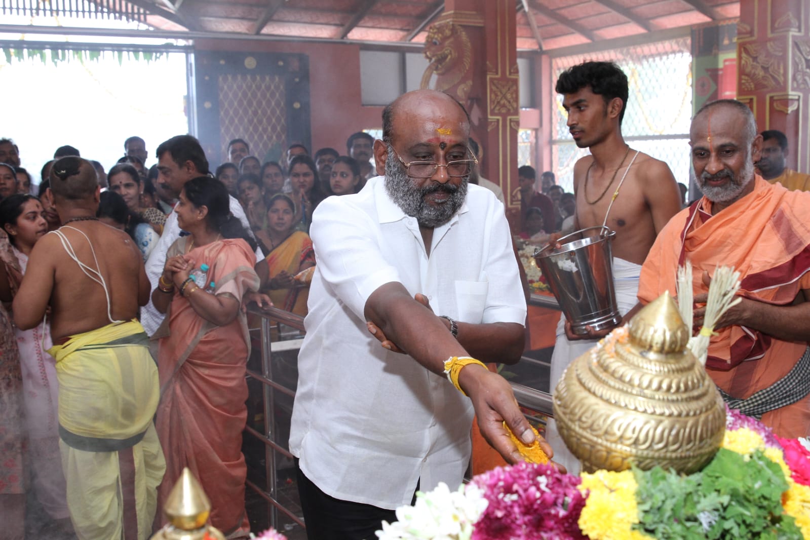 ಇದೇ ವೇಳೆ ಟೌನ್ಶಿಪ್ ಹಾಗೂ ದುರ್ಗಾ ಏಜೆನ್ಸಿ ಮುಖ್ಯಸ್ಥರಾದ ತಿರುಮಲೈಸ್ವಾಮಿ ತಂಬು ಅವರು, ದೇವರಿಗೆ ಸ್ವರ್ಣಲೇಪಿತ ಕವಚವನ್ನು ಕೊಡುಗೆಯಾಗಿ ಸಮರ್ಪಿಸಿ, ಕುಟುಂಬ ಸಮೇತ ಪೂಜಾ ಕಾರ್ಯದಲ್ಲಿ ಪಾಲ್ಗೊಂಡರು. ಅಲ್ಲದೇ ನೂರಾರು ಭಕ್ತರು ಕಲ್ಯಾಣೋತ್ಸವನ್ನು ಕಣ್ತುಂಬಿಕೊಂಡು ದೇವರ ಕೃಪೆಗೆ ಪಾತ್ರರಾದರು. ಪೂಜೆಯಲ್ಲಿ ಪಾಲ್ಗೊಂಡ ಭಕ್ತಾದಿಗಳಿಗೆ ದೇವಾಲಯದಲ್ಲಿ ಪ್ರಸಾದ ವಿನಿಯೋಗ ವ್ಯವಸ್ಥೆ ಮಾಡಲಾಗಿತ್ತು.